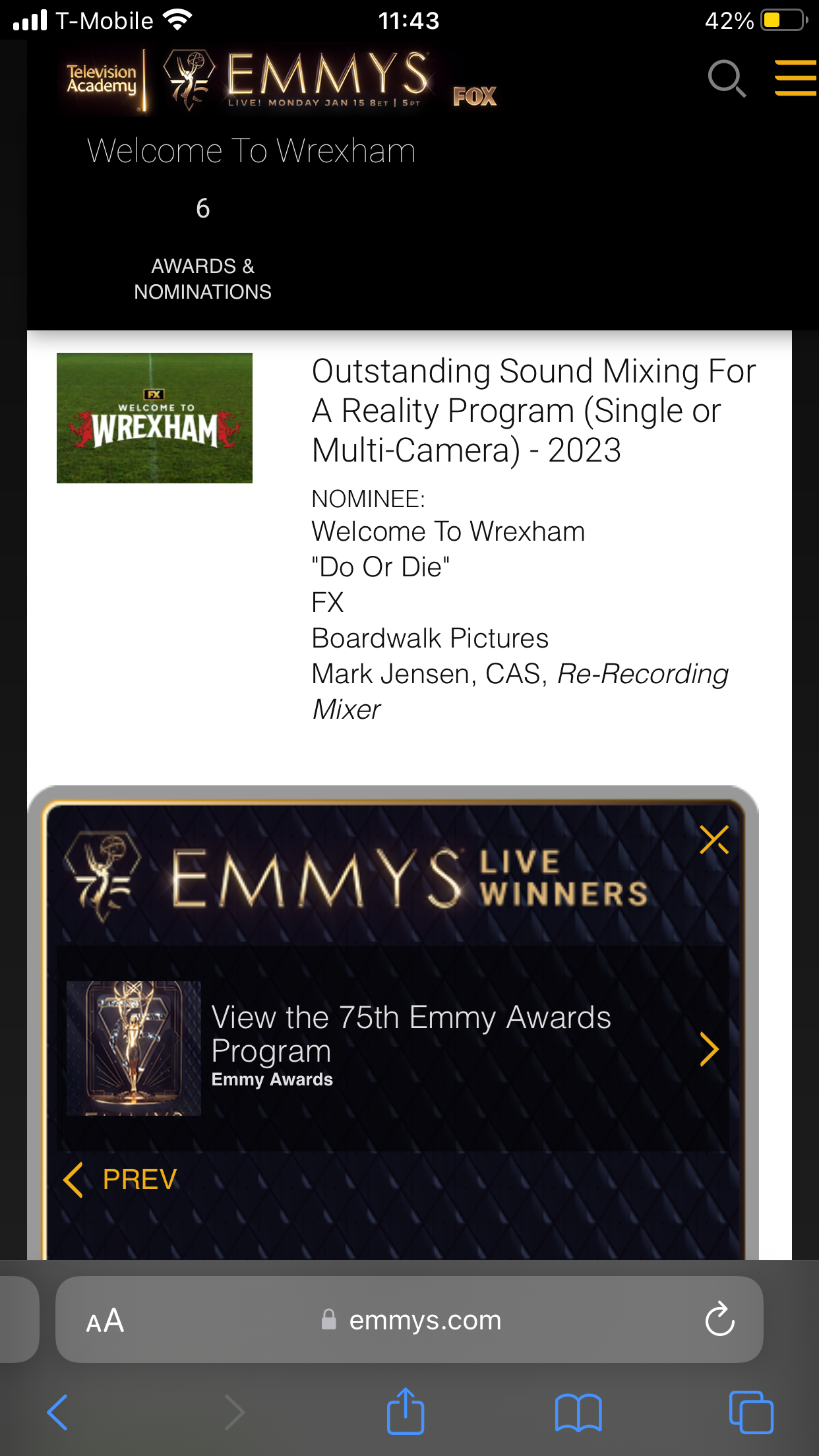 I’ve just learned that another project I did some days recording on “welcome to Wrexham” has also been nominated for an Emmy!